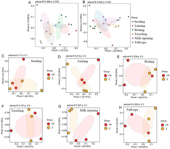 Principal coordinate analysis (PCoA) based on Bray–Curtis distance of the bacterial community in the rhizosphere of transgenic maize Ruifeng125 (A) and the control maize variety (B) at different growth stages. The p value represents the significant difference base on Student’s t-test (p < 0.05): (C) seedling stage; (D) jointing stage; (E) botting stage; (F) tasseling stage; (G) milk ripening stage; (H) full-ripe stage.