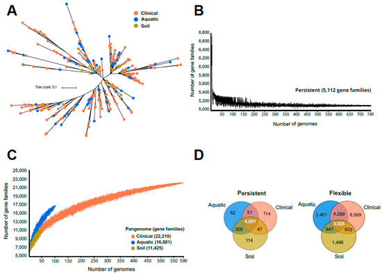 (A) Phylogenomic tree of dereplicated P. aeruginosa genomes (ANI > 99%). (B) Core genome size accumulation of the 749 P. aeruginosa strains of the three environments (clinical, aquatic, and soil). (C) Pangenome size accumulation of the 749 P. aeruginosa strains of the three environments (clinical, aquatic, and soil). (D) Venn diagram representing the relationship between the gene families of the persistent and flexible genome across the three environments.
