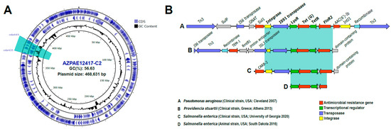Genomic analysis of the plasmids with multiple resistances revealed that, in one of them (pAZPAE12417-C2-436 Kb), multiple ARGs were concentrated in a region corresponding to an integron (Figure 3A). These non-chromosome-associated integrons are known as mobile integrons [53]. The ARGs identified within the integron were a tetracycline efflux MFS transporter, a sulphonamide-resistant dihydropteroate synthase, an AAC (6′)-Ib family aminoglycoside 6′-N-acetyltransferase, and the chloramphenicol/florfenicol efflux MFS transporter, FloR2. To analyse the dispersal capacity of this class of elements, a search for this integron was conducted in the NCBI non-redundant database. The results demonstrated the presence of the same integron and the associated ARGs, with a high identity (>95%), in microbes belonging to different orders within the class Gammaproteobacteria (Figure 3B). The P. aeruginosa strain containing this integron was obtained in 2007 from a cystic fibrosis patient in the USA [54]. However, the same mobile element was also recovered in other clinical and animal strains isolated worldwide. These include Providencia stuartii (clinical strain; Greece 2013), Salmonella enterica (clinical strain; USA, University of Georgia 2020), and S. enterica (animal strain; USA, South Dakota 2016). The co-occurrence of two mobile genetic elements, such as a plasmid and an integron, in disparate taxonomic species with high identity suggests the ease with which these elements can traverse taxonomic and geographical boundaries. Moreover, the integron enables not only the dissemination of ARGs but also their expression. This suggests that there is a significant possibility of dispersal and horizontal transfer of these elements between different environments, which could accelerate the evolution of resistance. In light of these considerations, there is a compelling need to develop effective multidisciplinary prevention and control strategies at both the clinical and environmental levels.