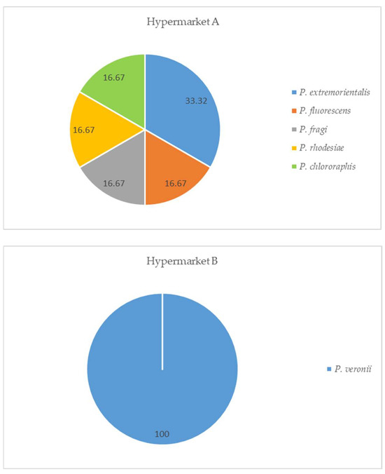 In relation to Pseudomonas spp. isolated from specific chromogenic medium for the isolation of this bacterium, five species were identified in hypermarket A: P. extremorientalis, P. fluorescens, P. fragi, P. rhodesiae, and P. chlororaphis, while in hypermarket B, only P. veronii was found (Figure 1).