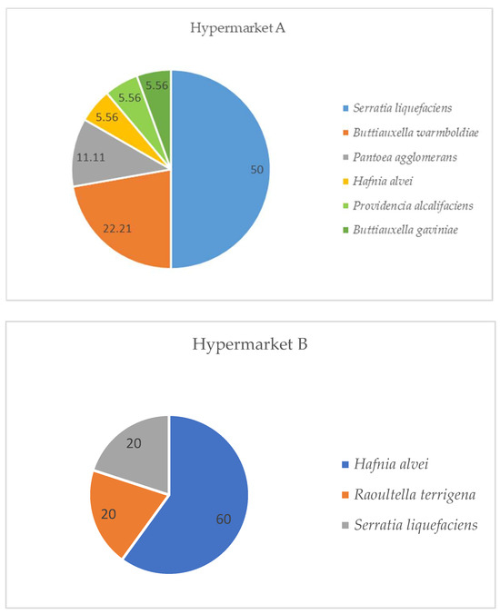 In relation to Enterobacteriaceae in horsemeat, in both hypermarkets Serratia liquefaciens and Hafnia alvei were identified. In the horsemeat from hypermarket A, the predominant genus was Serratia, with 50% of the isolates. In the case of horsemeat from hypermarket B, Hafnia alvei was the predominant species, with 60% of the isolates. The species B. warmboldiae, P. agglomerans, P. alcalifaciens, and B. gaviniae were found exclusively in hypermarket A (5.56–22.21%), while R. terrigena was isolated from samples of hypermarket B (20%). E. coli was not isolated in any sample (Figure 2).