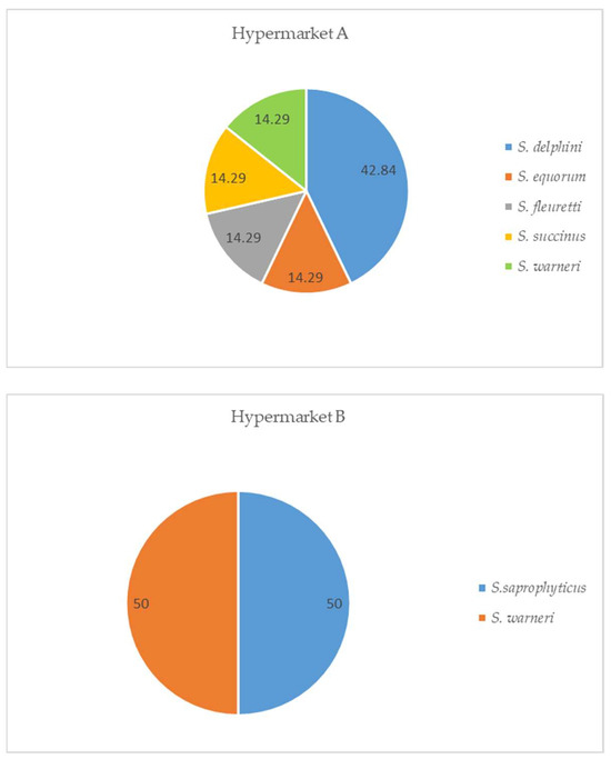 Figure 3 shows the Staphylococcus spp. identified in horsemeat samples. The species isolated most often from hypermarket A was S. delphini (42.84%), while in hypermarket B, the most often identified species were S. saprophyticus (50%) and S. warneri (50%). S. equorum, S. fleurettii, S. succinus, and S. warneri were also isolated from hypermarket A.