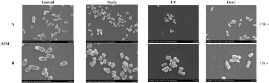 Culturable Y. enterocolitica cells were characterized by their rod or coccus shape, with intact and smooth surfaces, and exhibited a uniformly dense cytoplasm under electron microscopy. VBNC-state cells induced by low-level chlorine treatment (25 mg/L) showed partial preservation of the cell membrane, with some cells displaying reduced size and a less smooth surface compared to the Control cells. This observation indicated that chlorination disinfection impairs the cell membrane. In contrast, cells induced into the VBNC state by a low dose of UV radiation (100 mJ/cm2) maintained a more intact cell membrane, with only a slight reduction in size and a smoother surface observed in a few cells when compared to the Control. This suggests that UV disinfection does not affect the integrity of the cell membrane. In contrast, dead cells showed noticeable ruptures and severe wrinkling (Figure 6A,B).