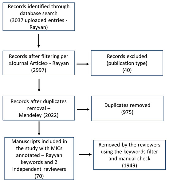 “MIC”, “MICs”, and “plant scientific name” (genus/species) were the keywords used for Rayyan searches. Using this strategy, it was possible to identify scientific articles pertaining to each plant that contained the terms “MIC” and “MICs” in the title, keywords, or abstract, and likely involved studies or evaluations of the MIC. Following this selection procedure, MIC detection was manually assessed for each record.