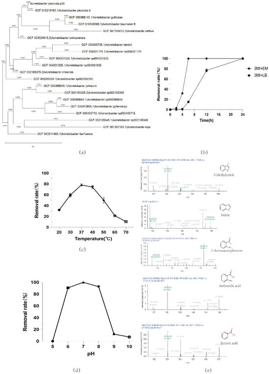 Figure 2. (a) Phylogenetic relationship of Acinetobacter_piscicola p38 16s RNA; skatole biodegradation by Acinetobacter_piscicola p38 under various growth conditions: (b) different cultivation times and culture media, 3MI + EM: 100 mg/L skatole + enrichment medium; 3MI + LB: 100 mg/L skatole + LB medium; (c) different temperatures; (d) different pH levels; (e) metabolite detection in cultures utilizing skatole as the sole carbon source.