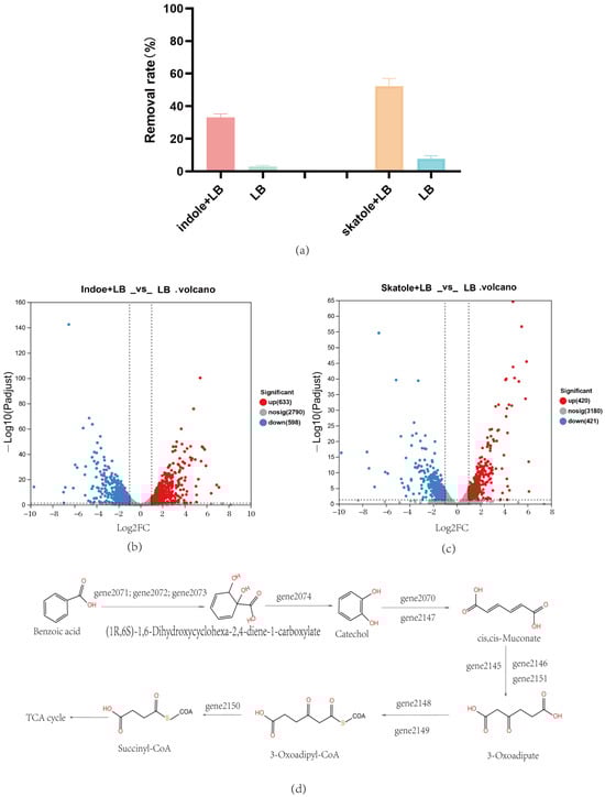 Figure 4. (a) Acinetobacter_piscicola p38 bacterial lysate study; (b) Indole + LB vs. LB: volcano plot of differential gene expression; (c) Skatole + LB vs. LB: volcano plot of differential gene expression; (d) Speculation of benzoic acid biodegradation mechanism by Acinetobacter_piscicola p38 through integrated analysis.