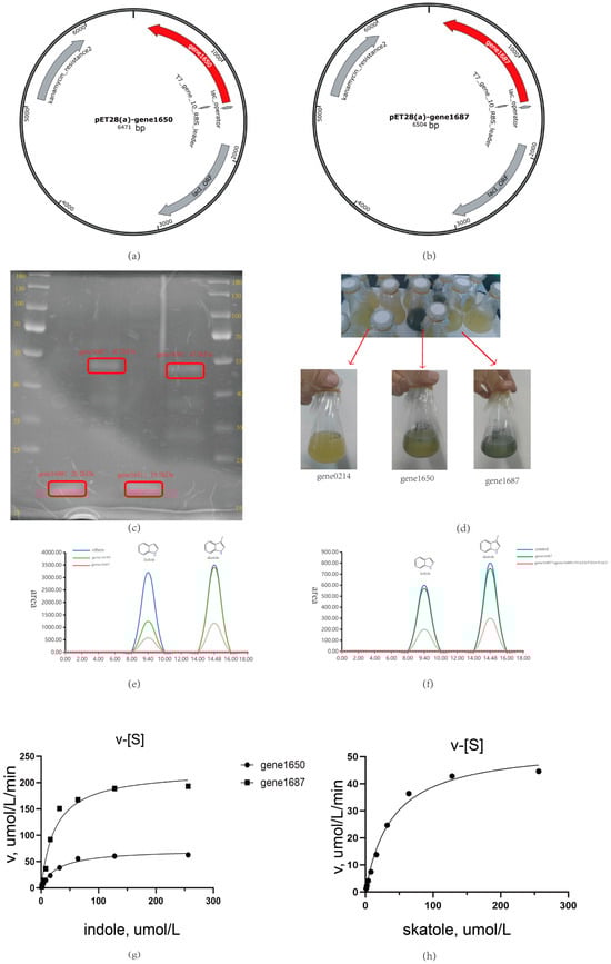 Figure 5. (a) Gene1650 plasmid; (b) Gene1687 plasmid; (c) Gene1650 and gene1687 heterologous expression coomassie brilliant blue staining; (d) Whole-cell biotransformation of indole; (e) Determination results of whole cell biotransformation by liquid chromatography; (f) Degradation of indole and skatole after purification of gene1687 protein; (g) The degradation rate of indole by gene1650 and gene1687; (h) The degradation rate of skatole by gene1687.