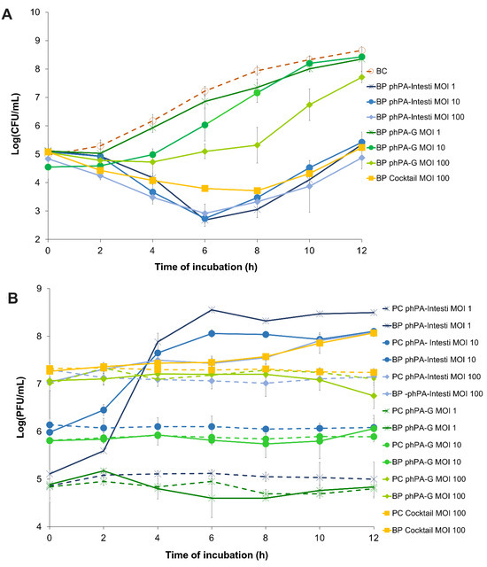 The effect of two phages alone (phPA-G and phPA-Intesti) at MOI 1, 10, and 100, and phage cocktail (phPA-G/phPA-Intesti) at MOI 100 against P. aeruginosa CHUC during 12 h of incubation. (A) Bacterial concentration: BC—bacteria control; BP—bacteria plus phage. (B) Phage concentration: PC—phage control; BP—bacteria plus phage. Values represent the mean of three independent assays, with three replicates in each condition. Error bars represent the standard deviation.