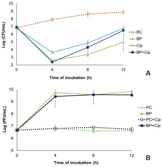Five groups were included as follows: a bacterial control containing only the bacterial biofilm (BC), a phage control containing only the phage phPA-Intesti (PC), a control containing the phage and antibiotic (PC + Cip), an antibiotic sample containing the P. aeruginosa biofilm and antibiotic (Cip), a sample containing the P. aeruginosa biofilm and the phage (BP), and a sample containing the P. aeruginosa biofilm, antibiotic, and phage (BP + Cip). All groups were incubated for 24 h at 37 °C without agitation. Aliquots of the test samples and controls were collected at 0, 4, 8, and 12 h. The quantification of phage and bacteria was performed as described in Section 2.5. Three independent experiments were performed, with three replicates in each condition.