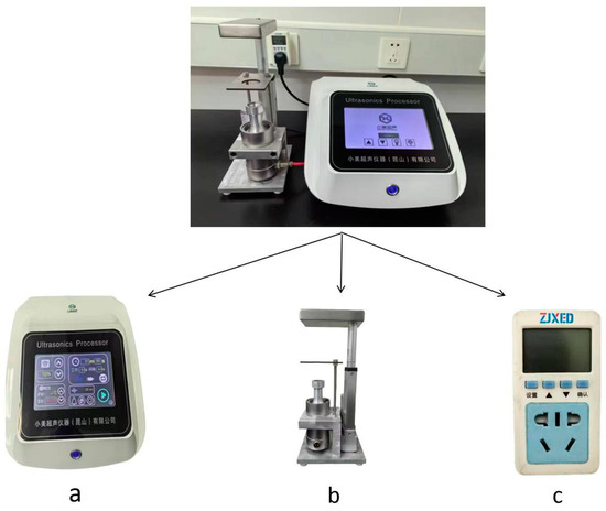 Figure 1. The non-contact power ultrasound meter. Parameters for ultrasound: frequency (20 kHz). The power density (D, W/mL) of the ultrasound dissipated into the medium with volume V is given by D = P/V, where P is the input power. The power intensity (I, W/cm2) dissipated from a probe tip with radius r is given by I = P/(πr2). The symbol “πr2” represents the cross-sectional area of the ultrasonic probe, where π is approximately equal to 3.14. (a) Microprocessor controller; (b) ultrasonic transducer; (c) input power monitor.