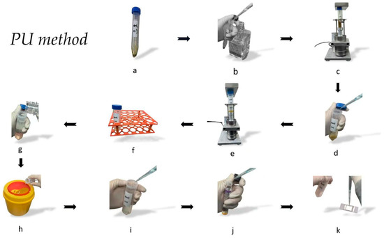 Figure 2. The PU method procedure. (a) Measured 0.1 g of the stool sample; (b) mixed with 6 mL of PBS; (c) underwent treatment with PU meter; (d) settled for 10 min, and 2 mL of the supernatant was mixed with an equal volume of 2% NaOH; (e) treated in the PU meter again; (f) incubated at room temperature for 10 min; (g) added 40 mL of PBS; (h) centrifuged, discarded the supernatant; (i) resuspended in 200 μL sterile PBS; (j) MGIT culture; (k) AFB smear microscopy. All the photographs were taken directly by our team using a HUAWEI Mate 60 Pro (HUAWEI, Shenzhen, China).