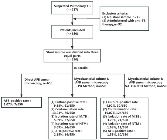 Stool samples were collected following the guidelines of the “Tuberculosis Laboratory Test Protocol (2015)” [28]. Subsequently, each stool sample was divided into approximately three equal groups. In addition to performing direct AFB smear microscopy (Baso, Zhuhai, China) using the Auramine O method, the stool samples were processed using different decontamination methods (NaOH-NALC vs. PU methods). Mycobacterial culture was performed using MGIT 960 (Becton Dickinson, Franklin Lakes, NJ, USA). Isolates were identified by MALDI-TOF MS (Bruker Daltonics, Bremen, Germany) or 16S rRNA gene sequencing.