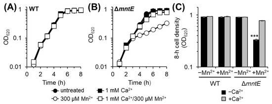 Previous reports demonstrate that S. pneumoniae lacking the Mn2+-specific CDF efflux transporter MntE (ΔmntE) is sensitive to elevated exogenous Mn2+ due to its inability to export Mn out of the cell and is thus considered Mn2+-stressed [27,30,39]. Likewise, we show here that the S. pneumoniae ΔmntE strain fails to reach wild-type (WT) cell densities after 8 h when cultured in rich medium with excess exogenous Mn (Figure 1). The addition of 1 mM Ca2+ to Mn2+-stressed ΔmntE permits growth patterns similar to unstressed cells, resulting in the complete rescue of its Mn2+-sensitive growth defect (Figure 1B,C). Ca2+ alone in the absence of Mn2+ stress had no significant effect on the growth of both the WT and ΔmntE strains (Figure 1).