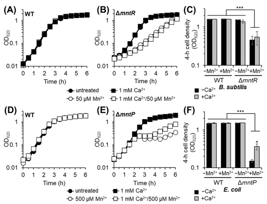 Akin to the S. pneumoniae WT strain (Figure 1A), the addition of Ca2+ or Mn2+ to rich growth medium did not significantly impact the growth of either the B. subtilis or E. coli WT strains (Figure 3A,D). Consistent with the published literature [41,44], B. subtilis, impaired in regulating intracellular Mn2+ levels (ΔmntR), and E. coli, deficient in Mn2+ efflux (ΔmntP), exhibited reduced growth in the presence of 50 and 500 µM Mn2+, respectively (Figure 3B,E). This reduced growth results from Mn2+ intracellular accumulation and intoxication [41,44]. The addition of 1 mM Ca2+ in the presence of Mn2+ stress did not significantly impact the growth of the B. subtilis ΔmntR strain (Figure 3B,C). We note that Mn2+-stressed B. subtilis ΔmntR cultures reached WT stationary cell density after 6 h incubation, independent of Ca2+ presence (Figure 3B). Incubation of B. subtilis ΔmntR with increased Mn2+ (100 µM) enhanced the growth defect, which was not further affected by Ca2+ presence (Figure S1).