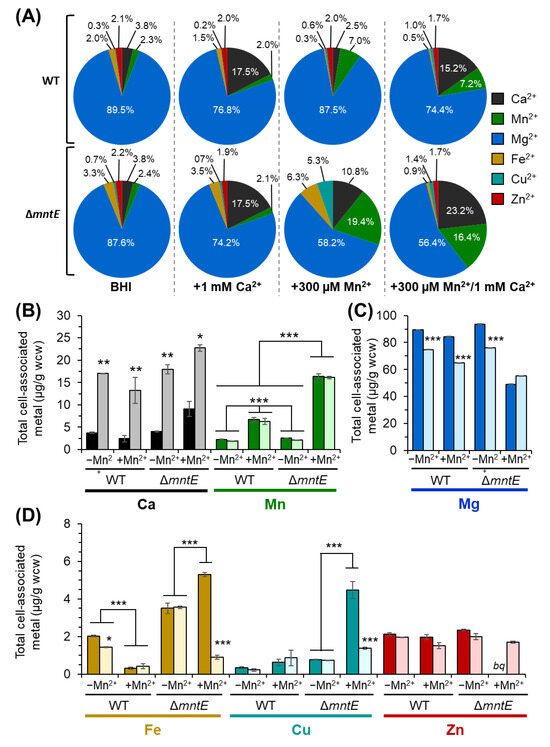 Culturing S. pneumoniae WT and ΔmntE strains with 300 µM Mn yielded a 3-fold and 8-fold increase in cell-associated Mn for the WT (2.25 ± 0.70 vs. 6.71 ± 0.51 µg/g wcw) and ΔmntE (2.56 ± 0.06 vs. 16.4 ± 0.55 µg/g wcw) strains, respectively (Figure 4B). The significant accumulation of cellular Mn2+ is consistent with the ΔmntE mutant being incapable of efficiently exporting Mn2+ out of the cell [27,39]. Interestingly, the Ca2+ levels increased 2-fold to 9.1 ± 1.7 µg/g wcw for the Mn2+-stressed ΔmntE mutant but were relatively unchanged for the WT strain when compared to unstressed cells (Figure 4B). The ΔmntE mutant cell-associated Mg2+ levels were reduced by almost 2-fold during Mn2+ stress, independent of Ca2+ presence (Figure 4C). Cell-associated Fe2+ and Cu2+ rose 1.5-fold (from 3.5 ± 0.28 to 5.3 ± 0.12 µg/g wcw) and 5-fold (from 0.8 ± 0.04 to 4.5 ± 0.46 µg/g wcw), respectively, for the ΔmntE mutant during Mn2+ stress (Figure 4D), which is consistent with previous reports showing elevated Mn2+ interferes with the expression of Fe2+ and Cu2+ homeostatic proteins [30]. No significant change in Zn2+ was observed for the WT strain cultured with Mn (Figure 4D); Zn2+ was below the quantifiable detection for the ΔmntE mutant. We note here that a high cellular Mn2+ concentration can disrupt Zn2+ homeostasis in S. pneumoniae by possibly binding to the Zn2+-sensing regulatory protein SczA and antagonizing its activity to properly regulate the expression of the Zn2+-specific CDF exporter CzcD [45] (see Section 3.6 for further support).