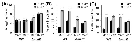 Qualitative assessment of CPS thickness using mucoviscosity assay during routine growth in rich medium revealed similar mucoviscosity levels for both the WT and ΔmntE strains (Figure 5B), which are consistent with those observed by McFarland et al., 2021 [29]. Upon Mn2+ exposure, both the WT and ΔmntE strains showed a significant increase in likelihood of remaining in solution, up to 2-fold compared to unstressed conditions (Figure 5B). Culturing with Ca2+ also reduced cell adherence ability; WT and ΔmntE cells were 4- and 2-fold less likely to adhere to the surface compared to unstressed cells, respectively (Figure 5B). Similar adherence levels were observed in the presence of Ca2+ during Mn2+ stress. We note that Ca2+-treated cells appeared “fluffy” and that the cell pellets were easily disrupted if care was not taken. Decreasing exogenous Ca2+ did not change these observations and had no significant effect on S. pneumoniae cells’ adherence ability (Figure 5C). Together, these data demonstrate that exogenous Ca2+ does not influence CPS production in S. pneumoniae D39 but may play a role in overall extracellular bacterial surface charge possibly via the expression of adhesion molecules, molecular binding determinants of adhesion molecules, or by other unknown mechanisms.