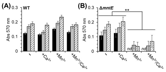 Like many other upper respiratory tract bacterial pathogens, S. pneumoniae forms a biofilm during asymptomatic carriage [46]. These biofilms can increase persistence in the host, as well as S. pneumoniae spread among the host population. Furthermore, initial colonization, biofilm formation, and dispersion of S. pneumoniae cells from the infection site are each influenced by multiple competing factors and environmental resources, including host nutritional immunity and viral co-infection [47,48]. Since changes in host Ca2+ levels have been shown to facilitate bacterial adherence [16,17] and cellular Mn2+ influences CPS production [29], we investigated the effect of Ca2+ and Mn2+ on biofilm formation. For these studies, S. pneumoniae was cultivated in TH broth as an alternative to BHI because of its ability to induce consistent biofilm formation [35]. The WT and ΔmntE strains showed no significant difference in biofilm formation when cultured in TH broth for 24 h (Figure 6). The addition of Ca2+ also did not significantly affect the biofilm formation of either strain. The WT strain biofilm formation was also not affected by Mn2+ or the combination of Mn2+/Ca2+ (Figure 6A). No detectable biofilm formation was observed for the ΔmntE mutant during Mn2+ stress independent of Ca2+ presence (Figure 6B).