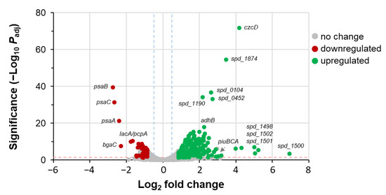 Volcano plot illustrating RNAseq analysis of differentially expressed genes in S. pneumoniae during Mn2+ stress. Comparison of WT strain cultured in BHI and ΔmntE mutant cultured in BHI plus 300 µM Mn2+. Genes showing significant difference (p ≤ 0.05; dashed blue lines) of ≥1.5 log2 fold change (dashed pink line) are shown in red (downregulated) and in green (upregulated); no significant changes are shown in grey. For a complete list of differentially expressed genes, see Tables S2 and S3.