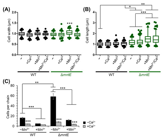 Cell morphology and chain length of S. pneumoniae strains stressed for 3.5 h. Width (A) and length (B) measurements of cells grown with or without 300 µM Mn2+ and 1 mM Ca2+ as indicated. Box and whisker plot with 95% confidence interval; WT strain shown as black and ΔmntE strain in green. (C) Mean number of cells observed per chain ±SEM; ***, p ≤ 0.001; **, p ≤ 0.05; and *, p ≤ 0.01.