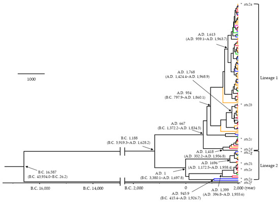 To estimate the phylogenetic evolution of the stx2A gene in E. coli isolated from humans, animals, and foods, we constructed a time-scaled phylogenetic tree based on the MCMC method (Figure 1). Firstly, the common ancestor of the present strains was estimated to date back to around 18,600 years ago (B.C. 16587; 95% HPDs, B.C. 43934.0–B.C. 26.2). Afterward, the stx2A gene diverged into the stx2a–2e, 2g, 2h, and 2o subtypes, and the stx2f subtype. Furthermore, the common ancestor between the stx2a–2d subtypes (Lineage 1) and the stx2e, 2g, 2h, and 2o subtypes (Lineage 2) was estimated to date back to around 3200 years ago (B.C. 1188; 95%HPDs, B.C. 5919.3–A.D. 1628.2). The strains belonging to Lineage 1 further diverged and formed the stx2a–2d subtypes over approximately 1350 years, while other subtypes diverged and formed the stx2e, 2g, 2h, and 2o subtypes over approximately 2020 years. Each stx2A subtype was widely distributed geographically. Next, an evolutionary rate of all strains was estimated as 8.42 × 10–5 substitutions/site/year (s/s/y). Interestingly, the evolution rates of the strains belonging to Lineage 2 (21 strains) were statistically higher than those of the strains in Lineage 1 (103 strains; 6.44 × 10–5 s/s/y vs. 5.01 × 10–5 s/s/y; p < 0.001). Furthermore, there was no distinct correlation between each strain and the countries where these were detected (Table S1). These results suggest that the stx2A genes evolved and diverged over an extremely long time, resulting in many subtypes.