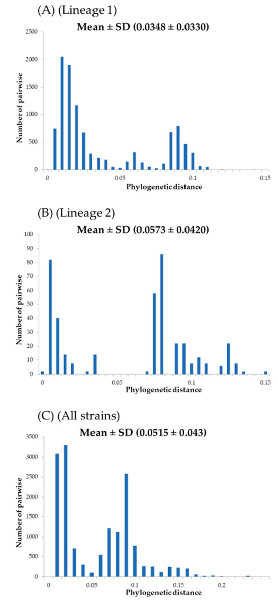 Phylogenetic distance of the (A) Lineage 1; (B) Lineage 2; (C) All strains represented as bar graph. The vertical axis indicates the number of pairwise and the horizontal axis indicates the phylogenetic distance. The mean and standard deviation of the phylogenetic distances are shown in the Figure. Statistical analyses were performed using the Kruskal–Wallis t-test and Horm’s method. Statistical analyses showed that the phylogenetic distances of the Lineage 2 strains were wider than those of Lineage 1 strains (p < 0.001).