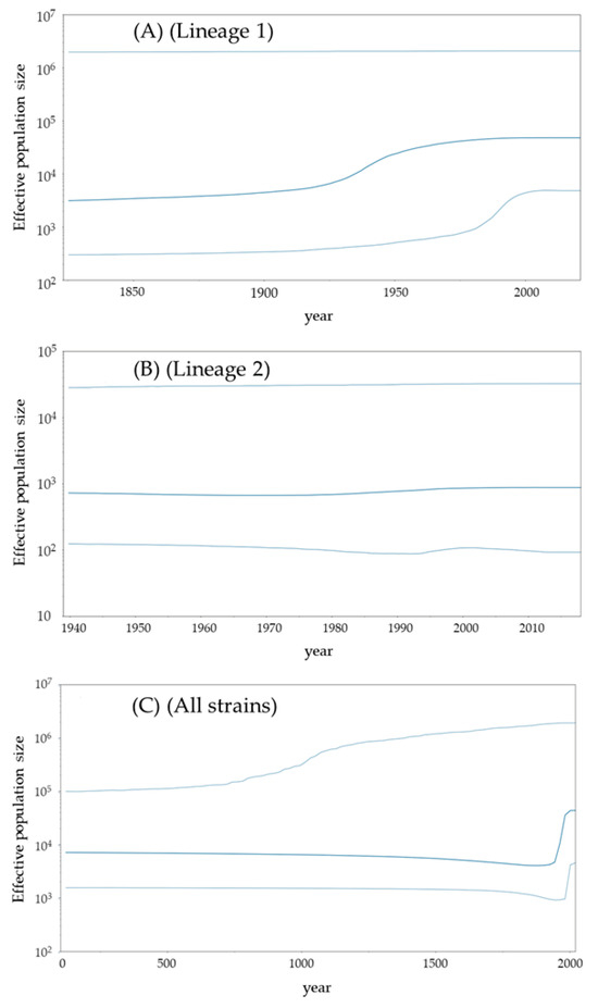 Phylodynamics of the present stx2A gene determined by Bayesian skyline plot analysis. (A) Lineage 1; (B) Lineage 2; (C) All strains. The x-axis shows time (year), and the y-axis represents the effective population size for each distance. The thick line in the center indicates the median effective population size, and the thin lines above and below show the 95% HPD. The genome population size of the Lineage 1 strains significantly increased around the 1930s. By contrast, the size of lineage 2 remained constant. Figure 3C shows the merged Lineage 1 and 2, where the upper line is not straight due to the presence of two peaks.