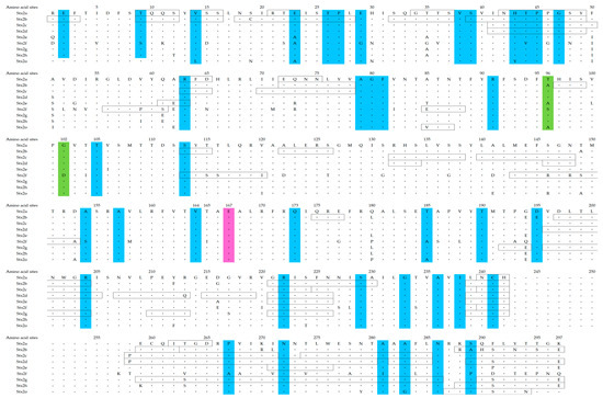 The Stx2A protein amino acid sequences investigated in this study. Amino acid sequences were aligned based on PDB data for each subtype of Stx2A and amino acid numbers were indicated. The black line boxes in the sequence are the conformational epitope. The negative selection sites, positive selection sites, and active site are highlighted in blue, green, and pink, respectively. Hyphens denote gaps not present in the PDB files. Forty negative selection sites were identified, two of which (aa164V and aa173Q) were located adjacent to the common Stx2 active site (aa167E). Only two positive selection sites were observed (aa96T or A or S, and aa102G or D).