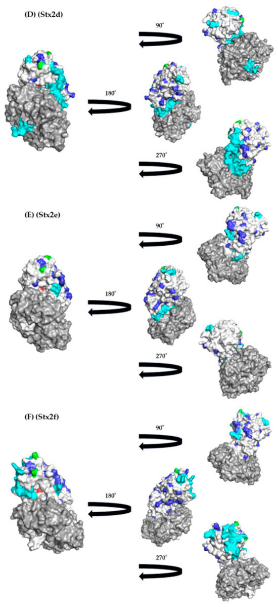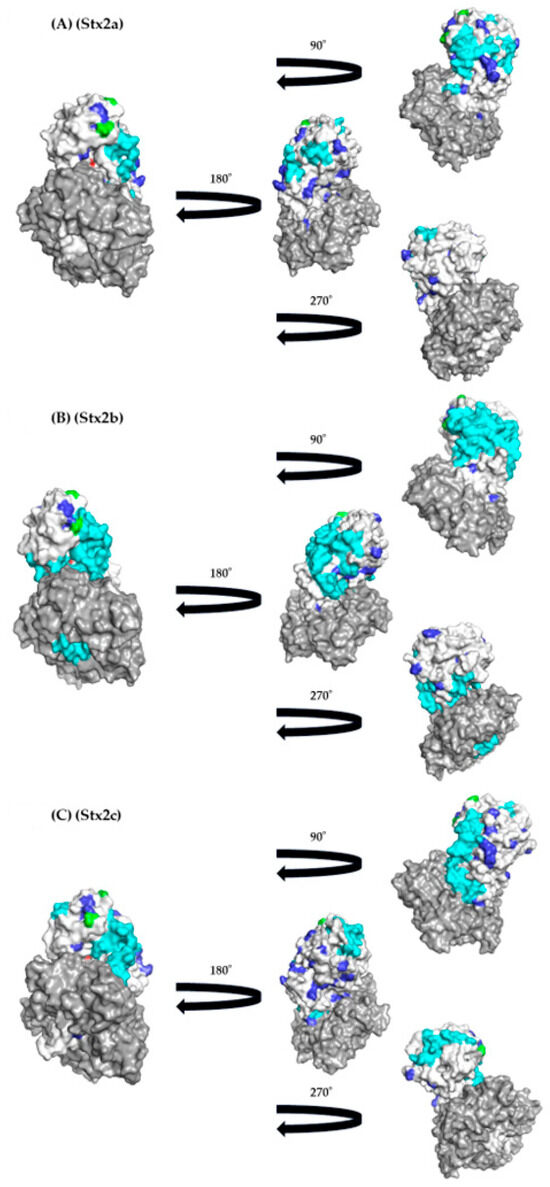 To gain a detailed understanding of the immunogenicity of the Stx2A proteins, we constructed three-dimensional structures and mapped conformational epitopes (Figure 5A–I). As a result, many conformational epitopes were identified in each subtype. However, a common epitope was not identified among the Stx2a–2h, and 2o proteins. Interestingly, some conformational epitopes may be located adjacent to the active site in some subtypes of the Stx2 proteins, including Stx2b–2d, 2f, and 2g (Figure 4 and Figure 5A–H). These results suggest that the host (humans) may be able to produce effective neutralizing antibodies against some subtypes of the Stx2A proteins.