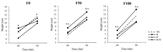 Plant height based on microbial inoculation at 60 and 90 dat in strawberry plants cv. San Andreas at different fertilization levels (F0 = without fertilization, F50 = 112-50-125 kg·ha−1 of N, P2O5, K2O, F100 = 225-100-250 kg·ha−1 of N, P2O5, K2O, WI = without inoculation, B = inoculation with Bacillus subtilis, R = inoculation with Rhizophagus intraradices, B + R = co-inoculation). * Statistical significance according to ANOVA (α = 0.05), n.s. no significance.