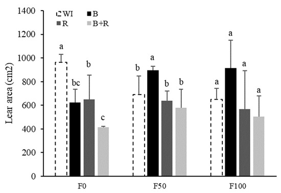 Leaf area (cm2) based on microbial inoculation at 90 dat in strawberry plants cv. San Andreas at different fertilization levels (F0 = without fertilization, F50 = 112-50-125 kg·ha−1 of N, P2O5, K2O, F100 = 225-100-250 kg·ha−1 of N, P2O5, K2O, WI = without inoculation, B = inoculation with Bacillus subtilis, R = inoculation with Rhizophagus intraradices, B + R = co-inoculation). Different letters in the same fertilization level are statistically different (LSD Fisher, α = 0.05).