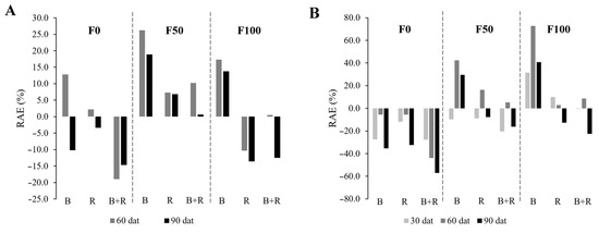 Relative Agronomic Efficiency (RAE %) of plant height (A) and leaf area (B) based on microbial inoculation at different fertilization levels (F0 = without fertilization, F50 = 112-50-125 kg·ha−1 of N, P2O5, K2O, F100 = 225-100-250 kg·ha−1 of N, P2O5, K2O, WI = without inoculation, B = inoculation with Bacillus subtilis, R = inoculation with Rhizophagus intraradices, B + R = co-inoculation).