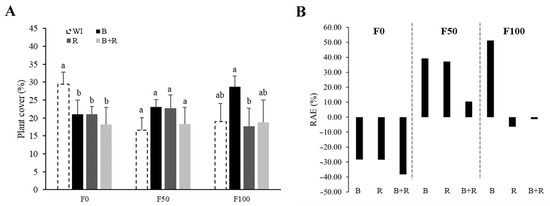 Plant coverage (%) based on microbial inoculation evaluated at the end of the vegetative stage (90 dat) at different fertilization levels (A) and RAE% for plant cover (B) (F0 = without fertilization, F50 = 112-50-125 kg·ha−1 of N, P2O5, K2O, F100 = 225-100-250 kg·ha−1 of N, P2O5, K2O, WI = without inoculation, B = inoculation with Bacillus subtilis, R = inoculation with Rhizophagus intraradices, B + R = co-inoculation). Different letters for the same fertilization level are statistically different (LSD Fisher, α = 0.05).