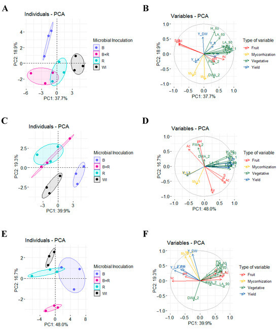 Principal Component Analysis (PCA) of evaluated parameters according to microbial inoculation without fertilization (A,B), with half dose of fertilization (C,D) and with full dose of fertilization (E,F). (A,C,E) Distribution of inoculation treatments in the principal components (WI = without inoculation, B = inoculation with Bacillus subtilis, R = inoculation with Rhizophagus intraradices, B + R = co-inoculation). (B,D,F) Distribution of the variables in the principal components (LA = leaf area; H = height; FWA = fresh weight aerial; DWA = dry weight aerial; PC = plant cover; My = mycorrhization; pH = pH; Ac = acidity; Fir = firmness; S = sugars; S_Ac = ratio sugars: acidity; Y_fr = yield expressed in fruit per square meter; Y_tn = yield expressed in tons per hectare; Y_LA = yield: leaf area index; Y_DW = yield: dry weight index; _30 = at 30 dat; _60 = at 60 dat; _90 = at 90 dat; _1 = first evaluation; _2 = second evaluation).