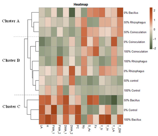 Heatmap with cluster analysis of the combined effects between chemical fertilization and microbial inoculation. The Y-axis indicates the doses of chemical fertilization and the inoculated microorganism. The X-axis indicates the evaluated parameters (LA = leaf area; H = height; FWA = fresh weight aerial; DWA = dry weight aerial; PC = plant cover; My = mycorrhization; S_Ac = ratio sugars: acidity; Fir = firmness; Y_fr = yield expressed in fruit per square meter; Y_tn = yield expressed in tons per hectare; Y_LA = yield: leaf area index; Y_DW = yield: dry weight index; _1 = first evaluation; _2 = second evaluation).