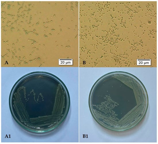 Microscopic picture of Pseudomonas koreensis BB2.A.1 at 400× magnification (A) and its culture on Nutrient agar plate (A1). Microscopic picture of Serrratia liquefaciens BB2.1.1 at 400× magnification (B) and its culture on Nutrient agar plate (B1).
