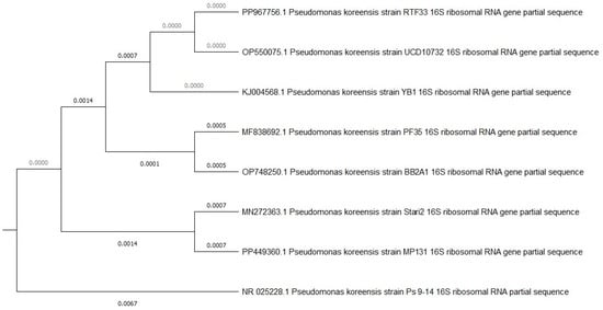 Phylogenetic tree based on a comparison of the 16S ribosomal DNA partial sequences Pseudomonas koreensis BB2.A.1 strain and some closest phylogenetic relatives. The tree was created using the neighbor-joining method.