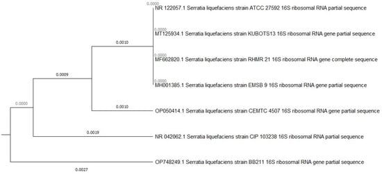 Phylogenetic tree based on a comparison of the 16S ribosomal DNA partial sequences Serratia liquefaciens BB2.1.1 strain and some closest phylogenetic relatives. The tree was created by the neighbor-joining method.