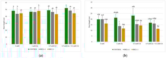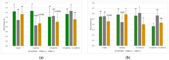 The Serratia liquefaciens BB2.1.1 bacterial strain increased (by 6.66%) the shoot length of maize plants when 1 mM zinc concentration was applied, compared with the uninoculated and treated control. Nonetheless, in the presence of cadmium and combined treatment, the S. liquefaciens BB2.1.1 bacterial strain decreased shoot length (by 11.51%, 14.63%). However, these differences were not statistically significant. A decreasing tendency can be observed in the case of root length, because the S. liquefaciens BB2.1.1 bacterial strain and the concentrations used reduced the examined parameter (by 10.37%–45.12%) compared to the inoculated and uninoculated controls.