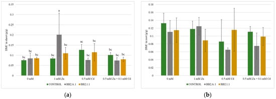 When inoculated with Serratia liquefaciens BB2.1.1, the bacterial strain increased DMC in the shoot in the presence of zinc treatment (27.27%), whereas the cadmium (8.33%) and combined treatment (20%) resulted in lower values compared to the uninoculated and treated samples. In the presence of bacteria, the Zn and Cd treatments increased (27.27%), whereas the combined treatment did not influence the DMC values in the shoot compared to the uninoculated and untreated controls. In the case of the root DMC values, we observed that inoculation increased the parameter in the presence of zinc and combined treatment (18.18%), while the cadmium concentration decreased (27.27%) the DMC values compared to the uninoculated and treated samples. Regarding the uninoculated and untreated controls, the DMC in the roots varied as follows: inoculation decreased the DMC in the presence of zinc (18.18%) or combined treatment (9.09%).