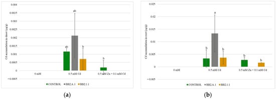 The Cd accumulation in the shoot (a) and the root (b) of the maize plants. Altogether, 5 plants were selected randomly from each treatment. One-way ANOVA followed by a Tukey test was computed to compare variables (mean ± standard error). Different letters represent significant differences among the treatments according to Tukey’s test (p < 0.05).