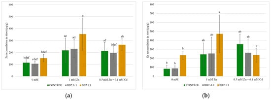 The results of zinc accumulation measurements are shown in Figure 8. The Pseudomonas koreensis BB2.A.1 bacterial strain slightly increased the accumulation of zinc in the shoot and roots in the presence of Zn treatment, while in the case of the combined treatment, a slightly decreasing trend was observed compared to the uninoculated and treated samples. A statistically significant difference was observed only in Zn-treated samples (1 mM Zn), where the Serratia liquefaciens BB2.1.1 bacterial strain stimulated the accumulation of Zn in the shoot compared to the inoculated control (131.49%) samples. Inoculation with the Serratia liquefaciens BB2.1.1 bacterial strain and the Zn treatment significantly increased zinc accumulation in the roots compared to that in the inoculated control (101.56%).