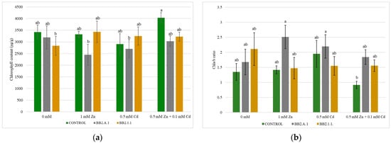 The Chla/b ratio showed a reverse trend compared to the total chlorophyll. Both bacterial strains increased the Chla/b ratio of the control samples, whereas when the trace metal treatments were applied, the inoculation with P. koreensis BB2.A.1 bacterial strain increased the ratio in all treatments.