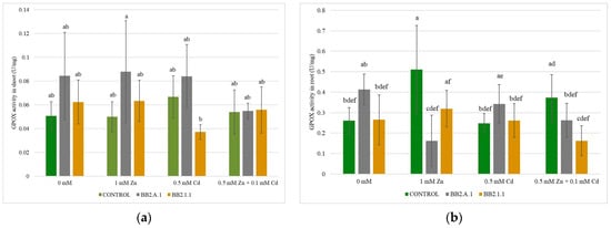 The Pseudomonas koreensis BB2.A.1 bacterial strain increased shoot GPOX activity in all treatments. Plants inoculated with this strain also had a higher Chla/b ratio in the leaves. Both physiological indicators are related to improved stress tolerance, which was induced by inoculation with the Pseudomonas koreensis BB2.A.1 bacterial strain. Root GPOX activity was decreased by the same bacterial strain in the presence of zinc. The Serratia liquefaciens BB2.1.1 bacterial strain increased GPOX activity in the shoot and root in the presence of zinc, while cadmium treatment decreased the activity. The bacterial inoculation induced the level of protective enzyme, that is beneficial in the abiotic stress condition. Chiboub et al. (2020) related that inoculation with a consortium (Pseudomonas sp., Pseudomonas fluorescens, and two R. sullae) in the presence of Cd treatment inhibited GPOX activity by 21%, and the exposure to double Cd concentration enhanced enzyme activity by 240% [38]. There are no data in the literature regarding the effect of the Pseudomonas koreensis and Serratia liquefaciens bacterial strains on GPOX enzyme activity.