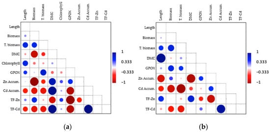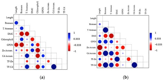 Pearson linear correlation between different shoot (a) and root (b) parameters in the case of the S. liquefaciens BB2.1.1 bacterial strain: length (cm), biomass (g), total biomass (g), dry matter content (DMC, g/g), chlorophyll (μg/g), guaiacol–peroxidase activity (GPOX, U/mg), Zn accumulation (μg/g), Cd accumulation (μg/g), Zn translocation factor (TF-Zn), Cd translocation factor (TF-Cd).