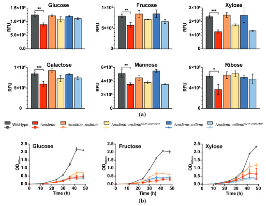 3.4. TiME Facilitates Growth of M. smegmatis on Different Monosaccharides