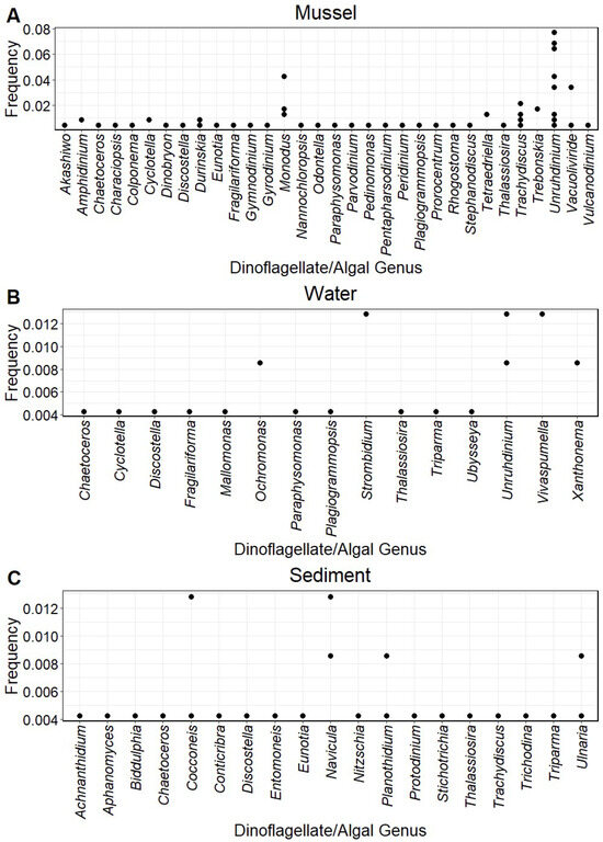 Frequency of 18S rDNA dinoflagellate and algal amplicons obtained from the guts of freshwater mussels ((A); n = 158), filtered water ((B); n = 35), and sediment ((C); n = 34) collected from rivers in the Mobile and Tennessee River basins. Frequency indicates how frequently the amplicon occurred in samples analyzed, and each point represents the frequency of an amplicon at a sample site or within a specific mussel species sampled from a site.