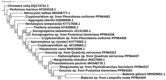 The Goussia sequence amplified from a sample of Quadrula verrucosa (PP964321) was 98.45% similar to an isolate from Goussia pannonica, a parasite of the white bream (Blicca bjoerkna) [63], and the Goussia sequence amplicon from Pustulosa kieneriana (PP964320) was 92.03% identical to an isolate of Goussia bayae, a parasite of the white perch (Morone americana) [64]. The Babesia amplicon obtained from a Lampsilis ovata (PP964429) was 97.17% identical to Babesia gibsoni, a tick-borne parasite that infects terrestrial mammals. This sequence is, however, closer to the Psuedoklossia and Margosiella sequences in the phylogeny, suggesting that this sequence could be unique. A likely route of entrance into freshwater systems could be runoff, similar to what has been seen with the genus Cryptosporidium. While having no cystic life stages, a related terrestrial apicomplexan that infects livestock (Theileria spp.) has been seen to infect electric eels in Brazil [64]. It is possible that unionid mussels could be exposed to parasites such as Goussia and Babesia, as their larvae feed on the blood of fish while attaching to their gills. This warrants further exploration.