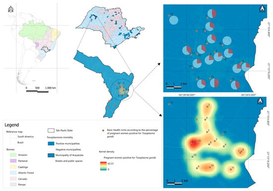 The analysis of the distribution of pregnant women attended prenatally and the seropositivity of T. gondii in 17 Basic Health Units (BHU) in Araçatuba, SP, Brazil, reveals fundamental data for understanding the prevalence of toxoplasmosis and identifying areas that require specific interventions. The variability in the distribution of pregnant women between the BHUs, ranging from 2.8% (BHU 14 and BHU 3) to 17.2% (BHU 12), reflects the disparity in demand and service capacity of the health units. This discrepancy may indicate an unequal distribution of resources and accessibility to prenatal health services, suggesting the need for more equitable allocation and improvement in health infrastructure [38]. Identifying these critical areas allows for more effective allocation of health resources.