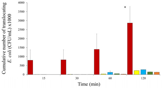 For the translocation assay, the co-culture of cells was seeded with 4 × 104 cells into a 0.8 µM pore size Millicell (Millipore, Burlington, MA, USA) insert containing 300 µL of EMEM and 20% FBS with antibiotics. Each insert was placed within a well of a 24-well plate containing 600 µL of EMEM without antibiotics. Cells were grown to confluence over 21 days to allow microvilli to form on the monolayer surface. The integrity of the cell lines grown in Millicell inserts was measured using transepithelial electrical resistance (TEER) between the inner and the outer chambers (TEER value of 590–662 Ωcm2) as described before [21]. Media within the inner wells were replaced with EMEM without antibiotics before addition of 100 µL of bacterial suspension, prepared as described above, and the microplate was incubated at 37 °C. Samples (100 µL) were collected from the outer well after 15, 30, 60 and 120 min of incubation, serially diluted and spread on MacConkey agar. After each sampling, 100 µL of fresh media was added to the outer well to maintain the volume at 600 µL. The MacConkey agar plates were incubated for 24 h at 37 °C, after which the number of translocating bacteria was calculated. Negative control strains included in translocation studies were E. coli JM109, E. coli KIC-1 (which has been shown to be capable of translocation in laboratory animals [21,23] but lacking T6SS-1 [15]), E. coli 73–89 (capable of adhering to the gut epithelium in animal models but not translocating [8]) and E. coli 46-4 (a non-adhering/non-translocating strain in animal models [15,21]).