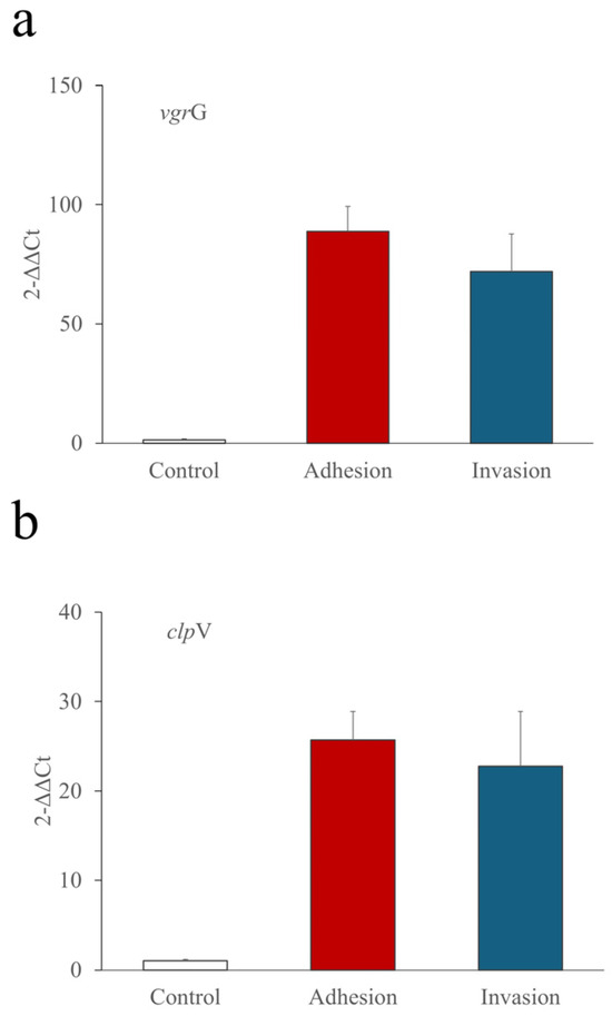 The role of T6SS-1 in adhesion and invasion of HMLN-1 was tested by measuring the differential expression of the genes vgrG (Figure 2a) and clpV (Figure 2b) before and after HMLN-1 interaction with the cell co-culture. The results showed a significant increase in the expression of both genes after adhesion and invasion of HMLN-1 to the cell co-culture (Figure 2).
